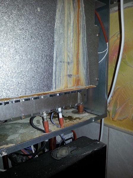 Koronnym przykładem takiej sytuacji jest niepodłączenie odprowadzenia skroplin z odskraplacza przy kotłach z zamkniętą komorą spalania. Poniżej zdjęcia wnętrza prawie nowego kotła (kilka miesięcy eksploatacji) który uległ uszkodzeniu właśnie z takiego powodu. Oprócz silnej korozji elementów dochodzi też często do zalania i zniszczenia elektroniki sterującej kotła (koszt 400 - 1500 zł) gdyż zazwyczaj znajduje się ona poniżej komory spalania i agresywny kondensat może do niej spłynąć - tak jak to widać na załączonych fotografiach. Bez względu na to, czy będzie to kocioł Vaillant, Termet, Saunier Duval, De Dietrich czy jakikolwiek inny - szkody zawsze będą znaczne.